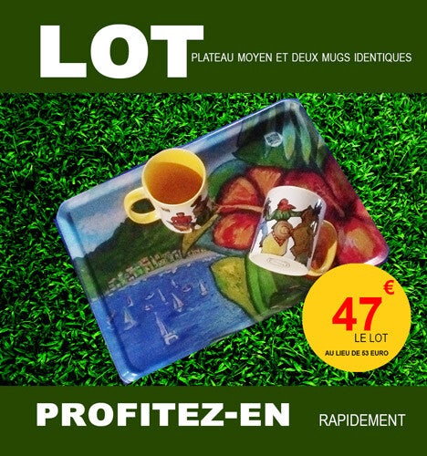 Saisissez cette offre exceptionnelle : le lot comprend deux mugs identiques et un plateau, le tout pour seulement 47€ au lieu de 53€