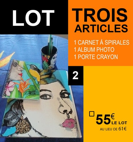 Saisissez cette offre exceptionnelle : le lot comprend un pot à crayon, un carnet à spirales et un album photo A4 avec 100 poches photo, le tout pour seulement 55€ au lieu de 61€